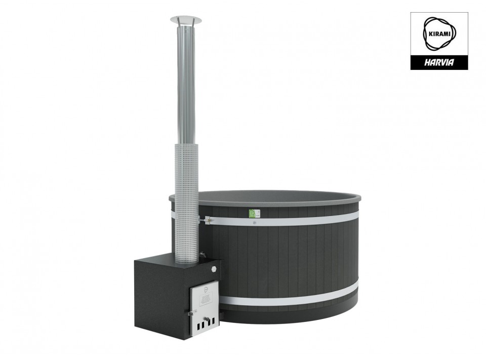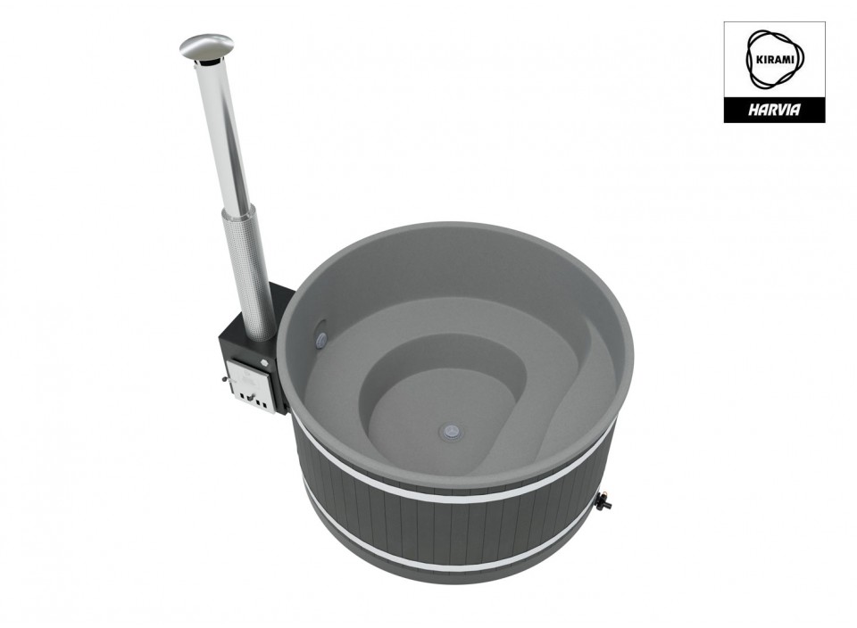 6 à 8 personnes - V: 1930 l - H: 110 cm - ø: 200 cm - EcoPlank noir - Coque grise - Poêle Cube 35 kW
