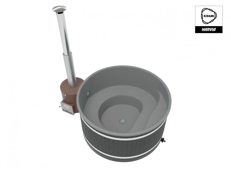 6 à 8 personnes - V: 1930 l - H: 110 cm - ø: 200 cm - EcoPlank noir - Coque gris clair - Poêle Tube 42 kW