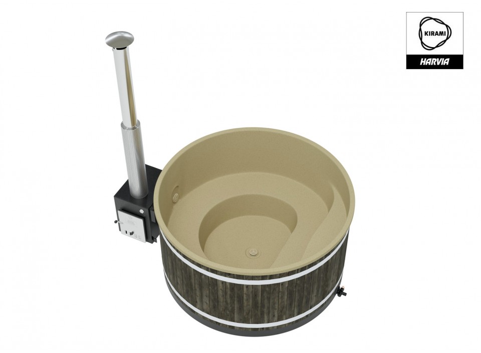 6 à 8 personnes - V: 1930 l - H: 110 cm - ø: 200 cm - Teinte charbon - Coque beige - Poêle Cube 35 kW