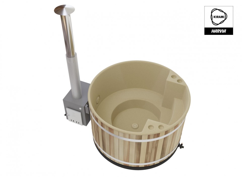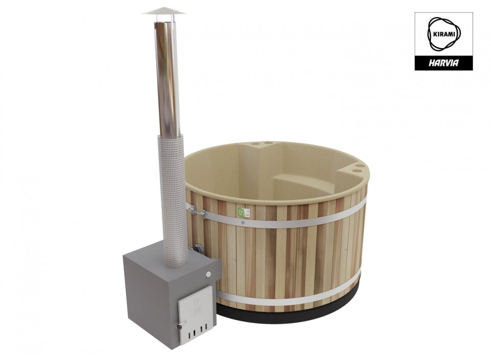 3 à 5 personnes - V: 1370 l - H: 110 cm - ø: 170 cm - Cèdre rouge - Coque beige - Poêle Macu 29 kW