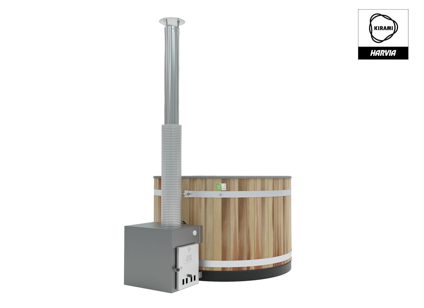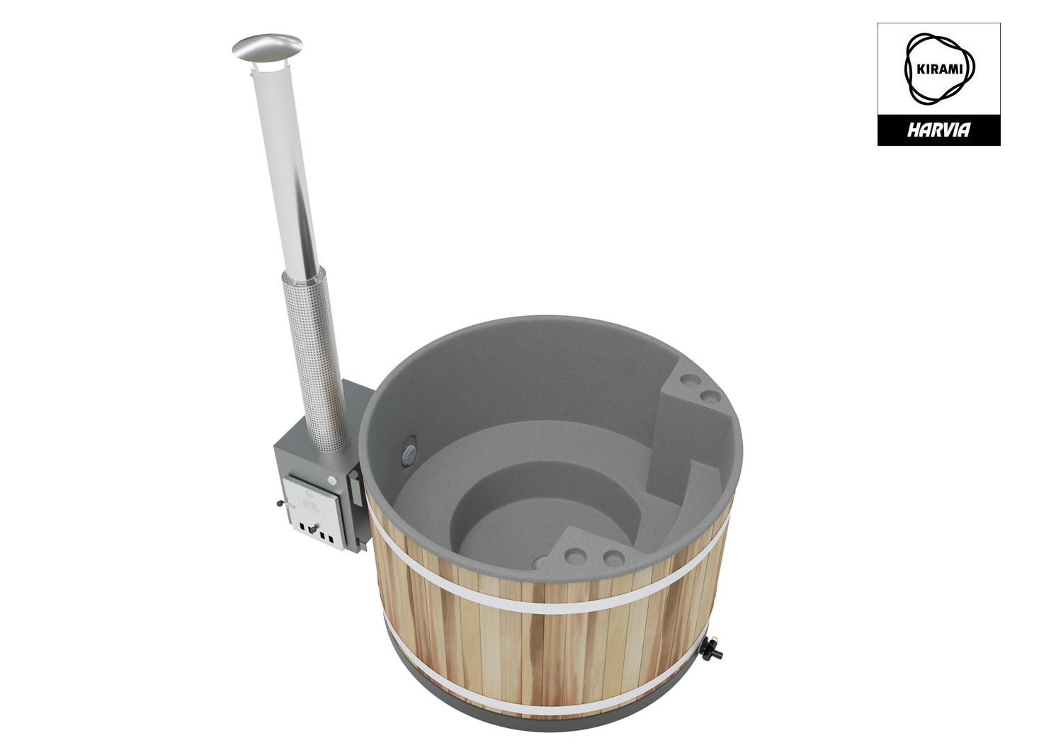 3 à 5 personnes - V: 1370 l - H: 110 cm - ø: 170 cm - Cèdre rouge - Coque gris clair - Poêle Macu 29 kW