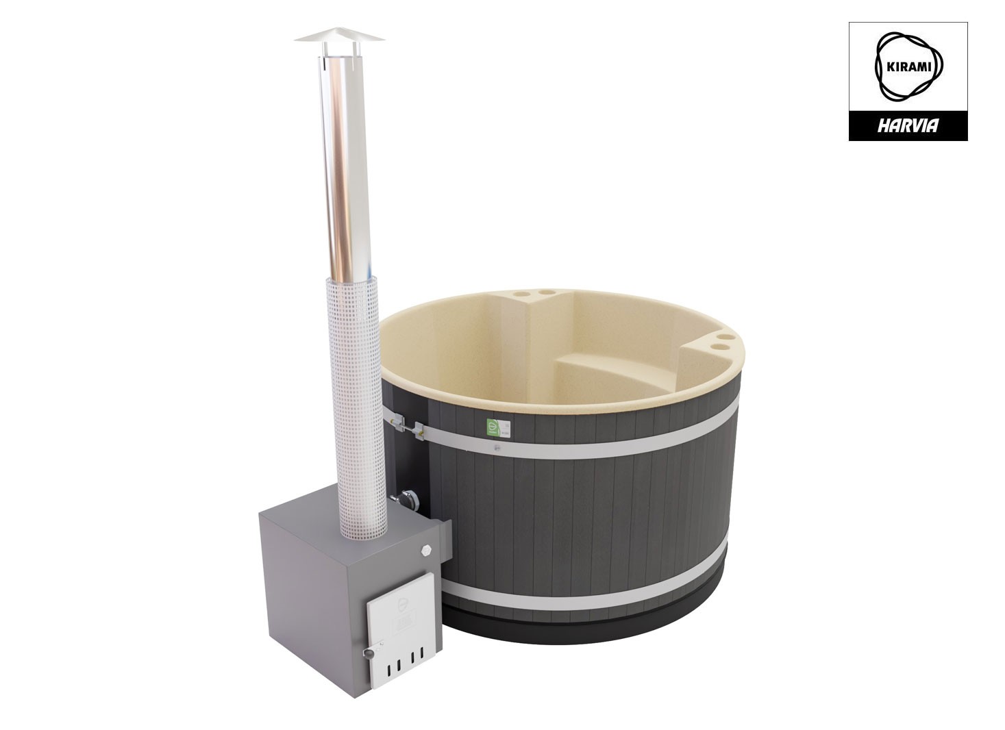 3 à 5 personnes - V: 1370 l - H: 110 cm - ø: 170 cm - EcoPlank nuit-noire - Coque beige - Poêle Macu 29 kW