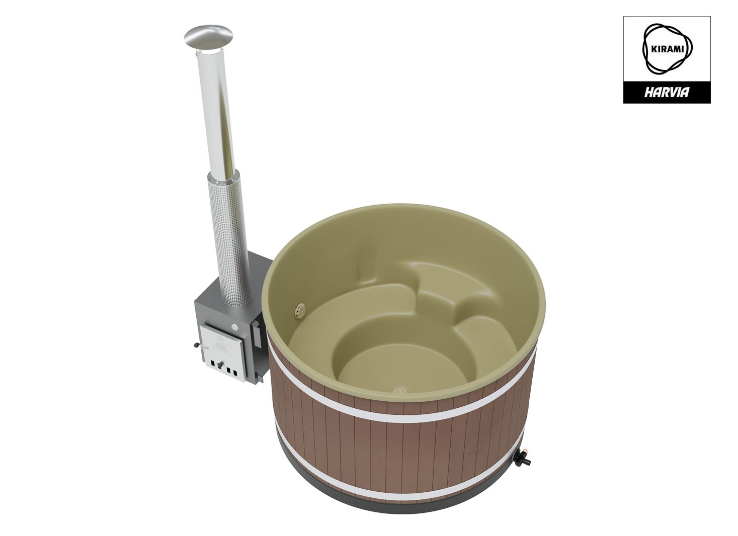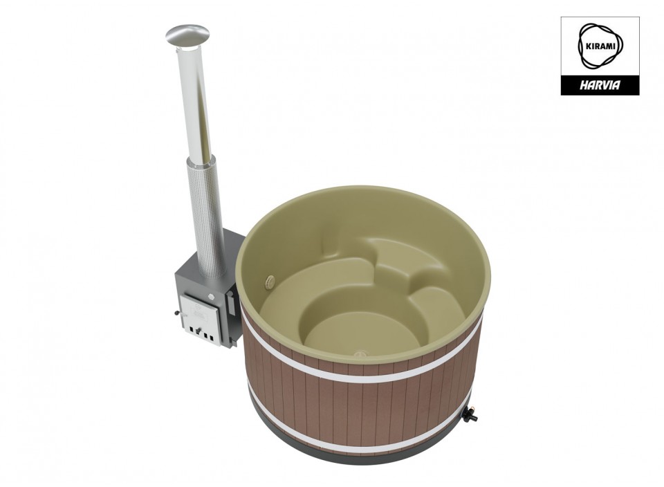 4 à 6 personnes - V: 940 l - H: 107 cm - ø: 170 cm - Mocca - Coque intérieure caramel beige - Poêle Macu 29 kW