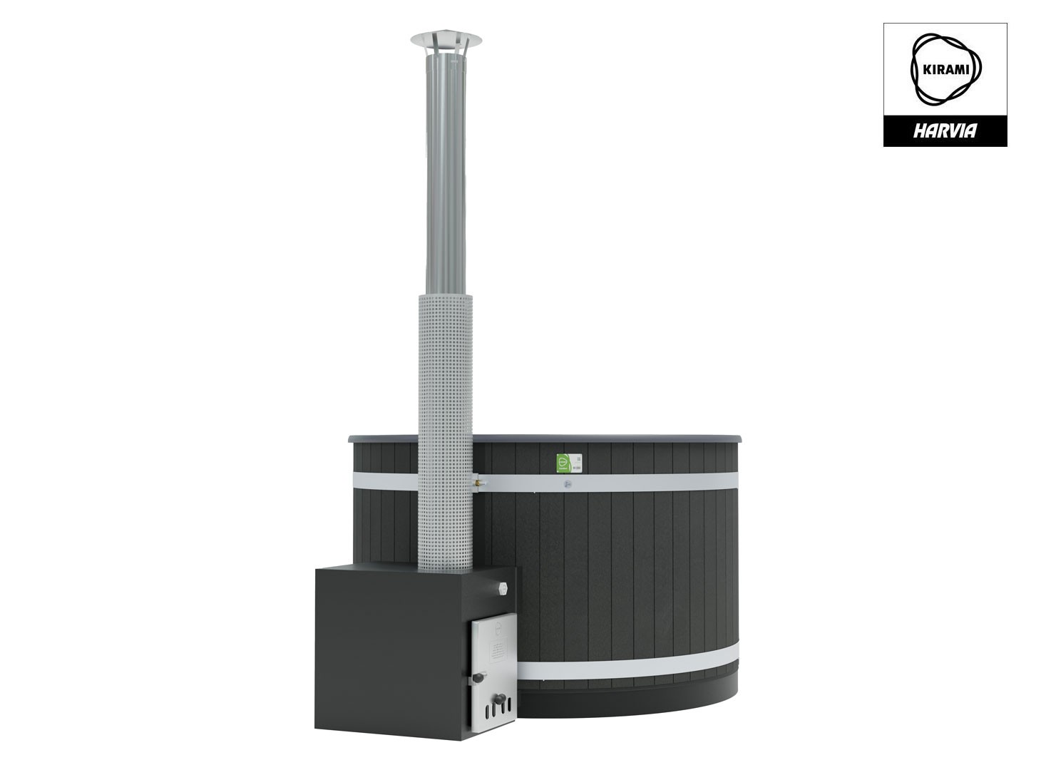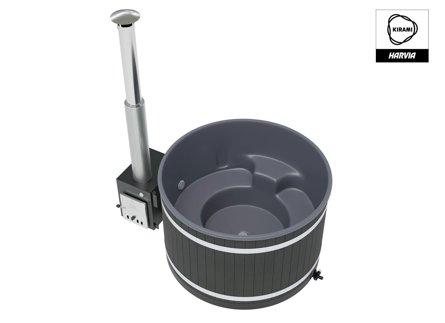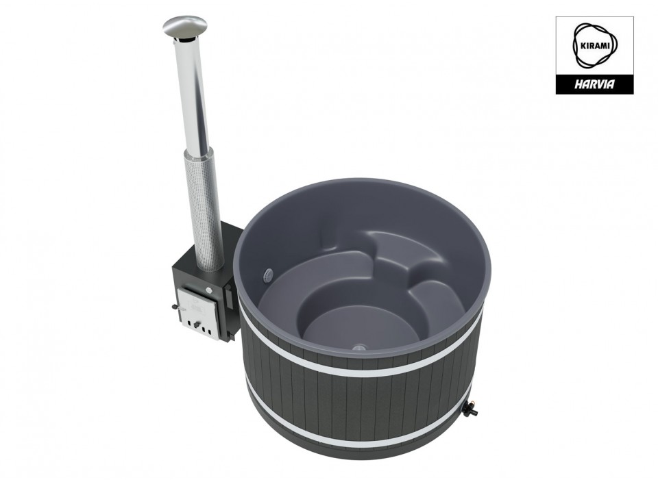 4 à 6 personnes - V: 940 l - H: 107 cm - ø: 170 cm - EcoPlank noir - Coque grise - Poêle Cube 35 kW