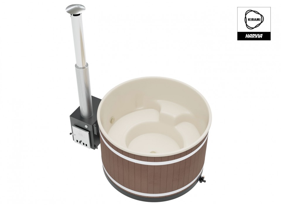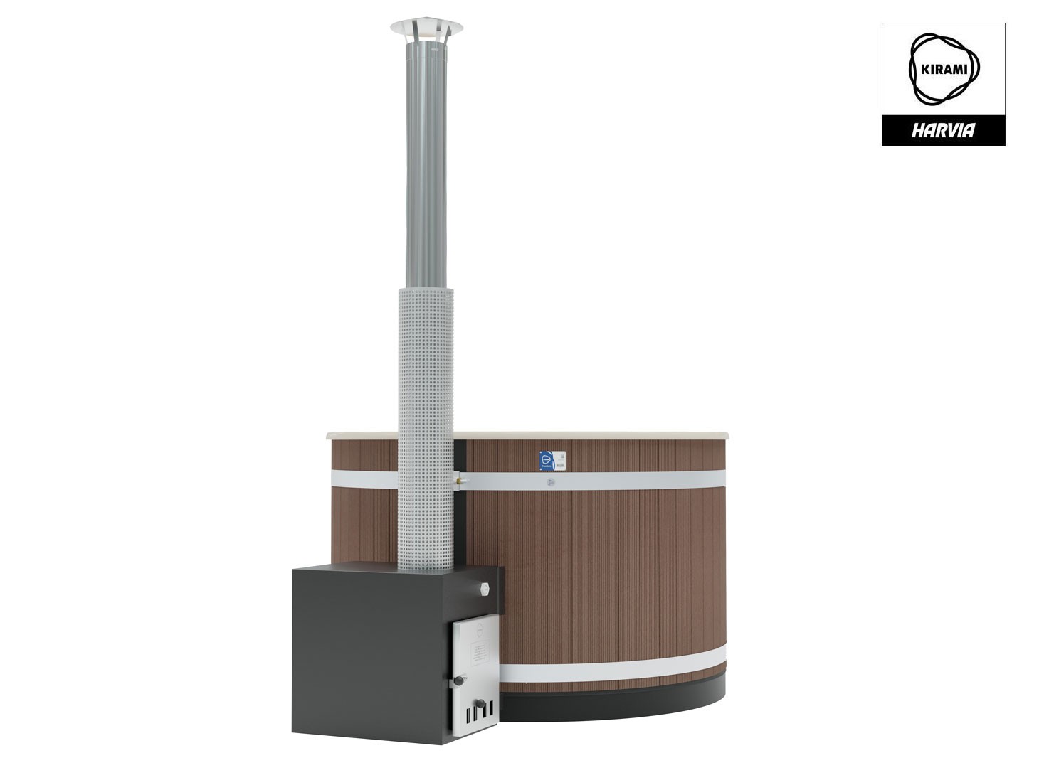 4 à 6 personnes - V: 1420 l - H: 107 cm - ø: 172 cm - Panneaux composites mocca - Coque champagne - Poêle Cube 35 kW