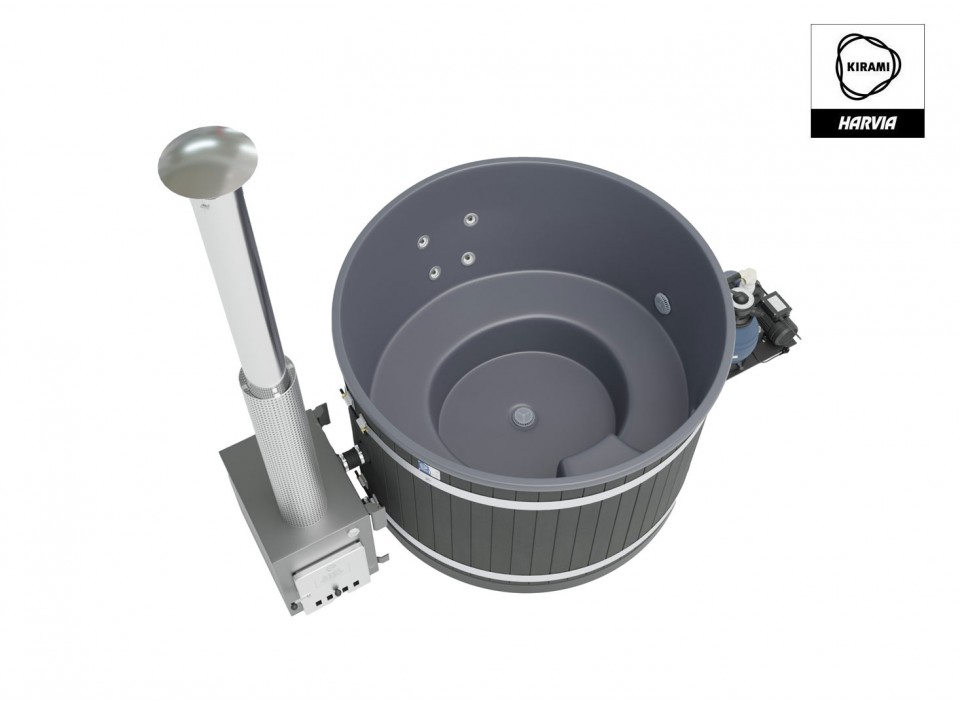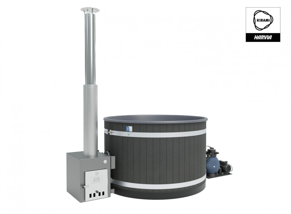 Le Kirami Premium Steady M Flow Hybrid combine le meilleur des deux mondes : un chauffage électrique de 3 kW avec filtration et jets massants, complété par un poêle à bois Macu. Une solution idéale pour un usage flexible et performant en extérieur en Suisse.