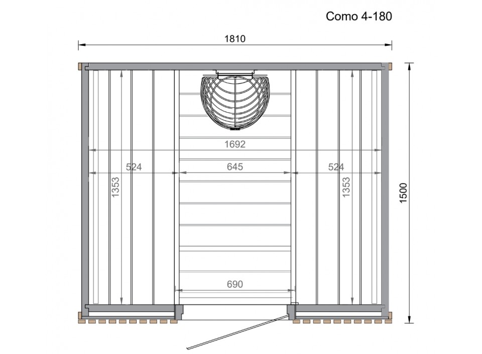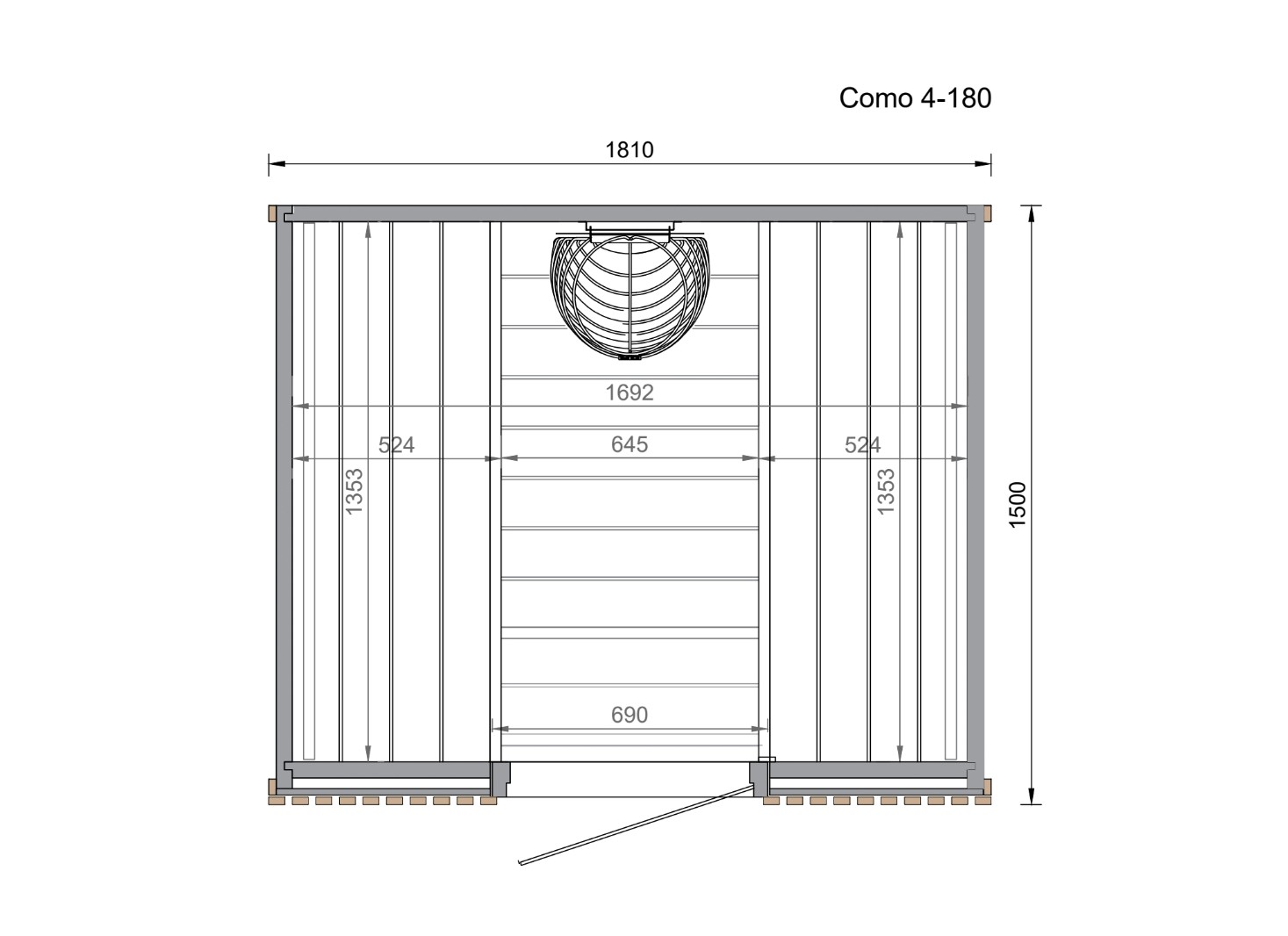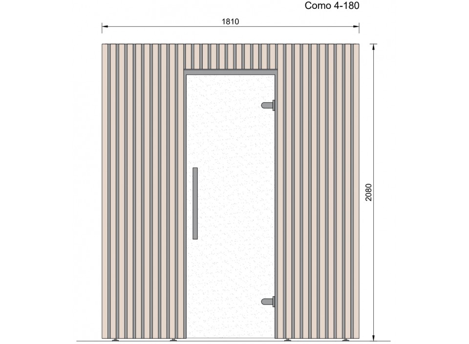 Le sauna Como 4-180 est construit avec des éléments muraux en bois thermotraité de 40 mm, garantissant robustesse et durabilité. La façade avant, ornée de barres verticales, apporte une touche moderne et élégante.
