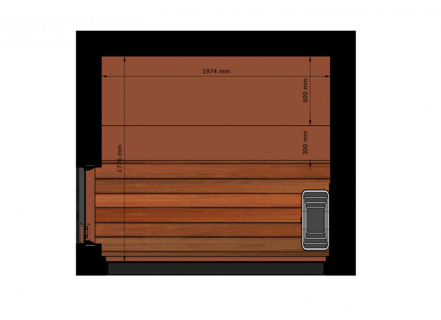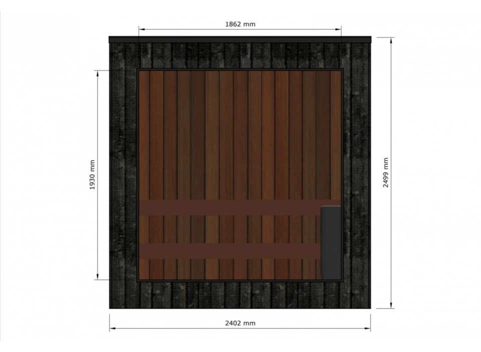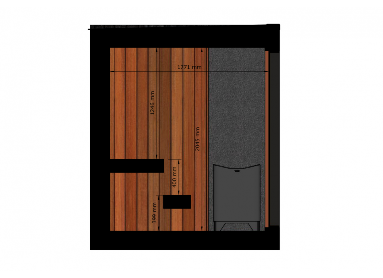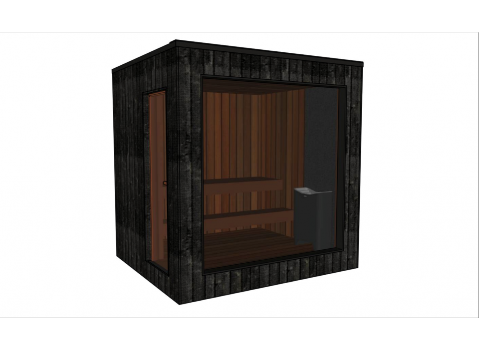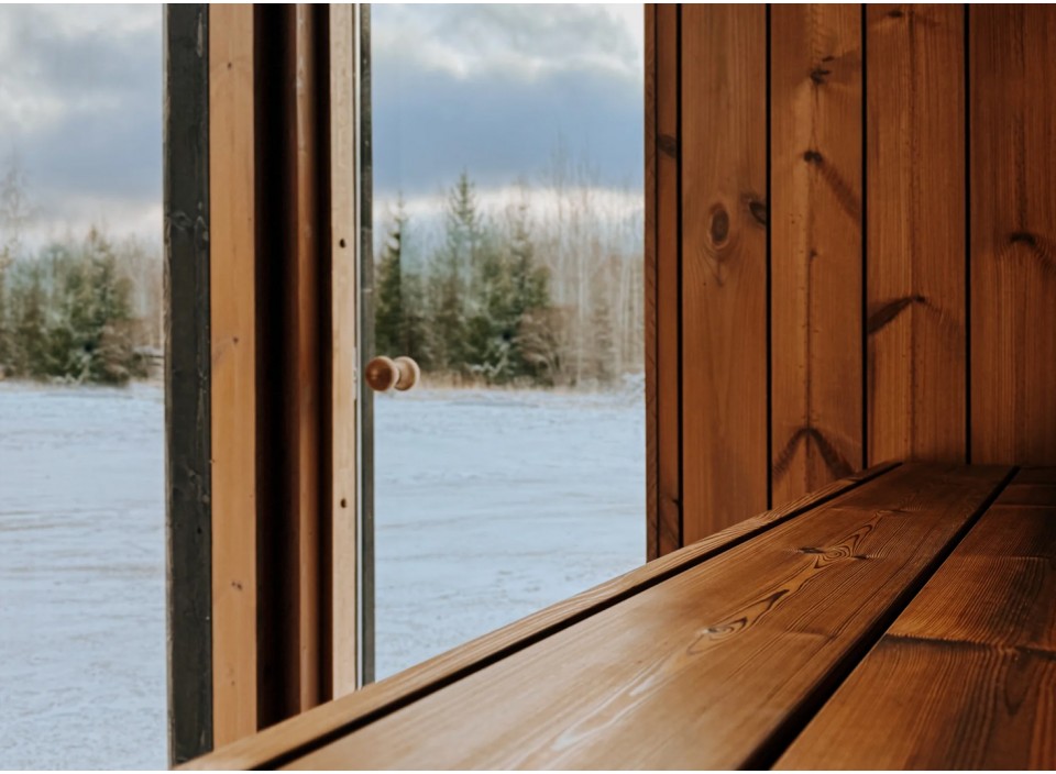 - Intérieur en pin ou tremble thermotraité, résistant aux fluctuations de température et d’humidité, ainsi qu’aux champignons et parasites. Les panneaux sont protégés par une cire spéciale sauna, appliquée sur les murs, le plancher et les bancs.
