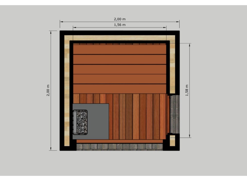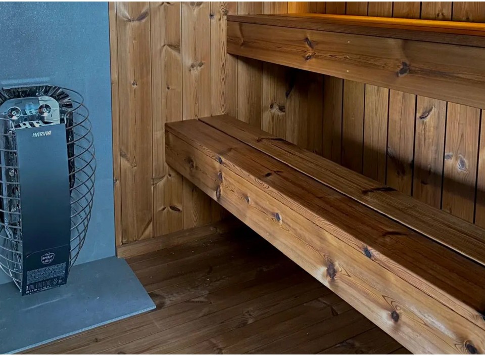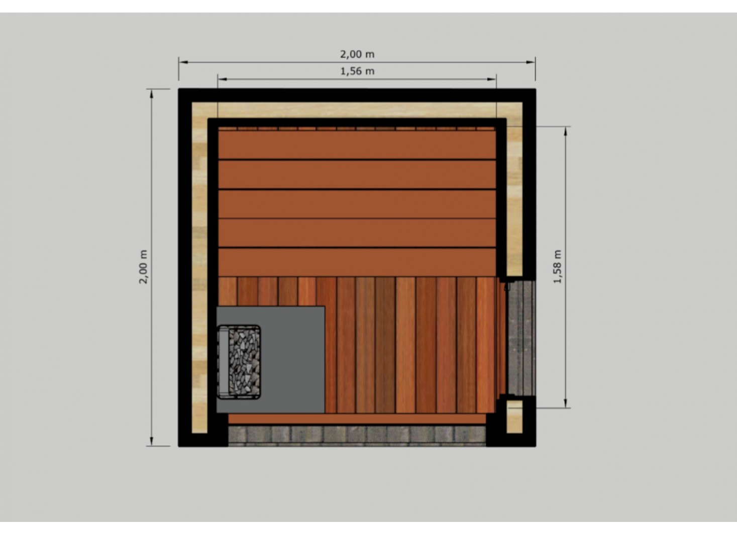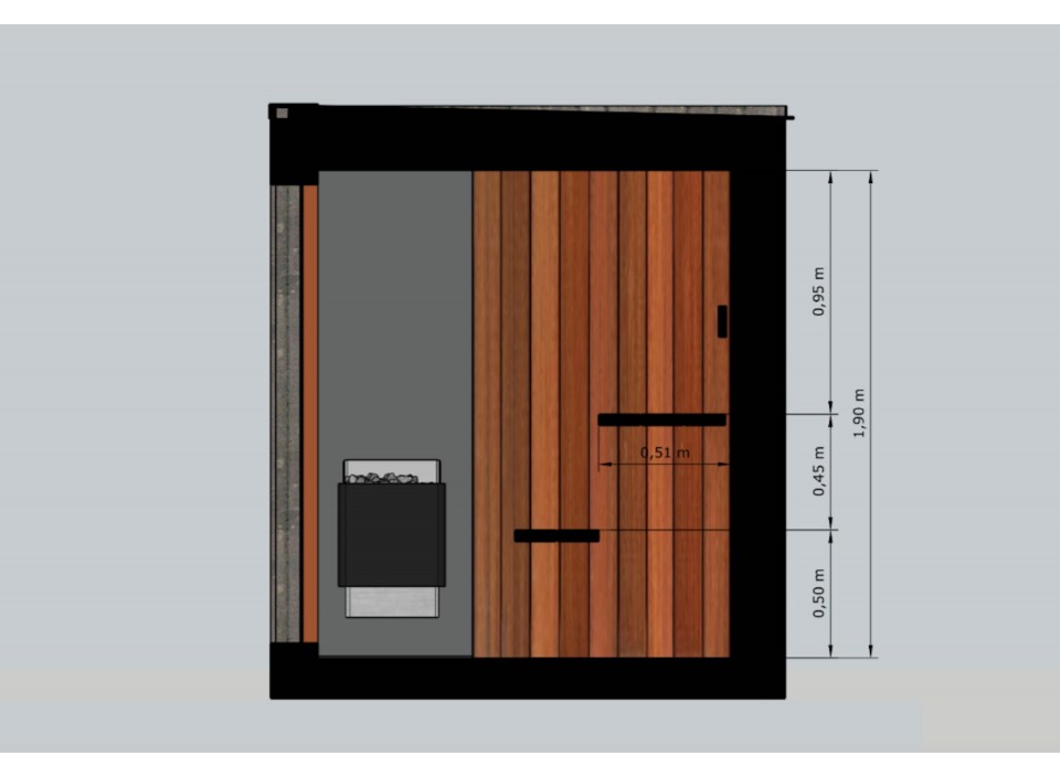 - Intérieur en pin thermotraité, résistant aux variations de température et d’humidité, ainsi qu’aux champignons et parasites. Les panneaux sont protégés par une cire spéciale sauna appliquée sur murs, plancher et bancs.