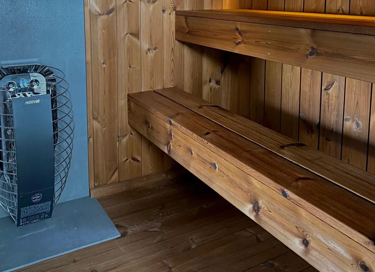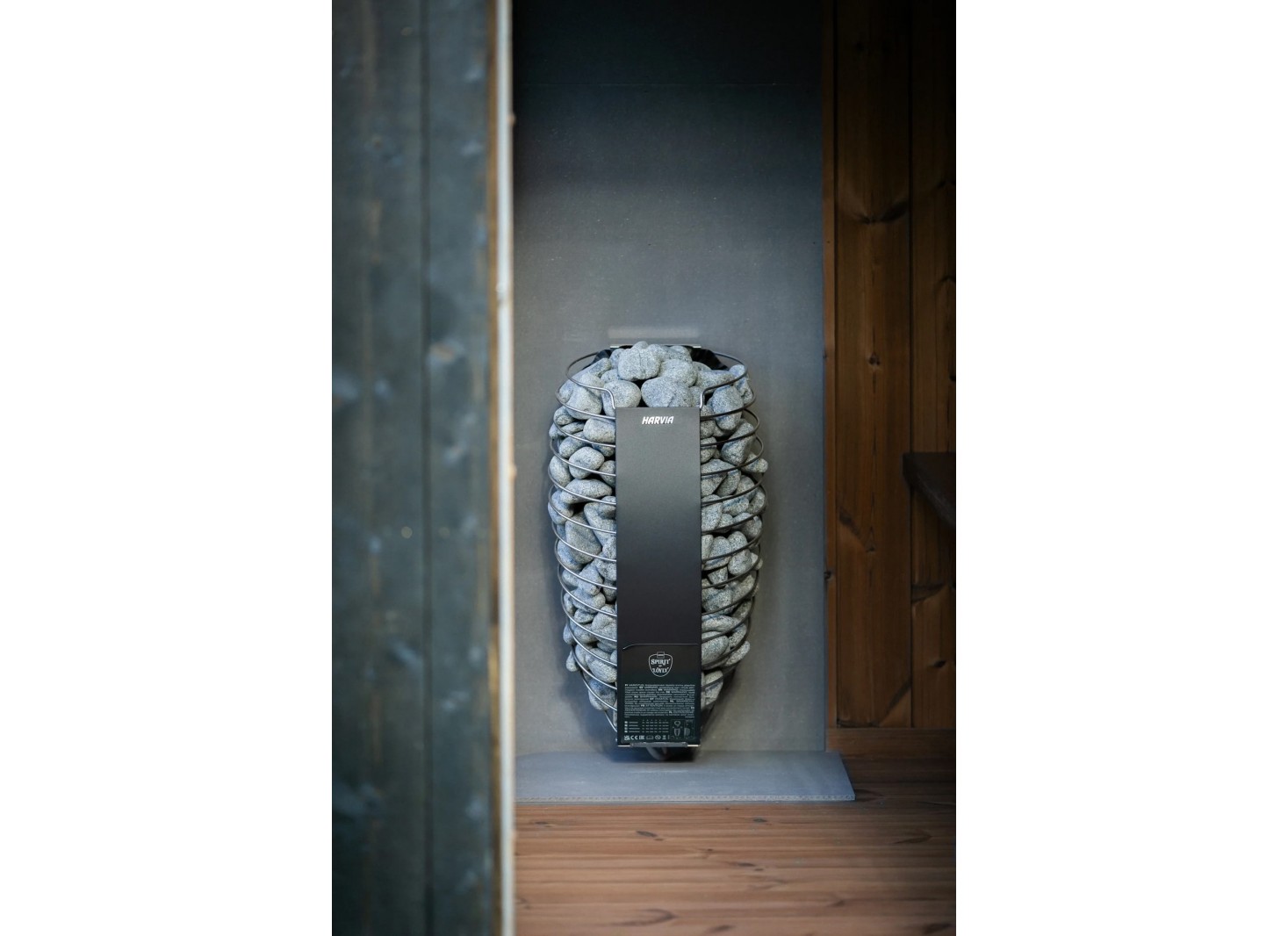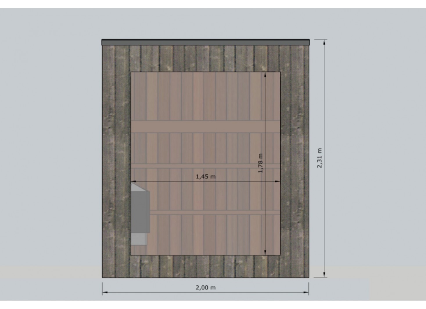 - Intérieur en pin thermotraité, résistant aux variations de température et d’humidité, ainsi qu’aux champignons et parasites. Les panneaux sont protégés par une cire spéciale sauna appliquée sur murs, plancher et bancs.