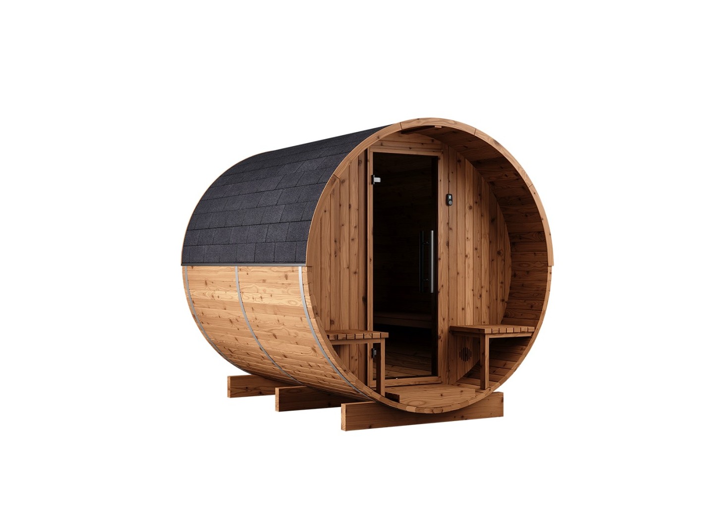 Maintenant, nos saunas en tonneau ont des parois plus épaisses et une meilleure stabilité grâce aux 40 mm d'épicéa nordique (Nordic Spurce) Thermo. Thermowood est plus léger que du bois traité de façon traditionnelle, il a aussi des avantages structurels permettant de faciliter le transport et l'installation de votre sauna.