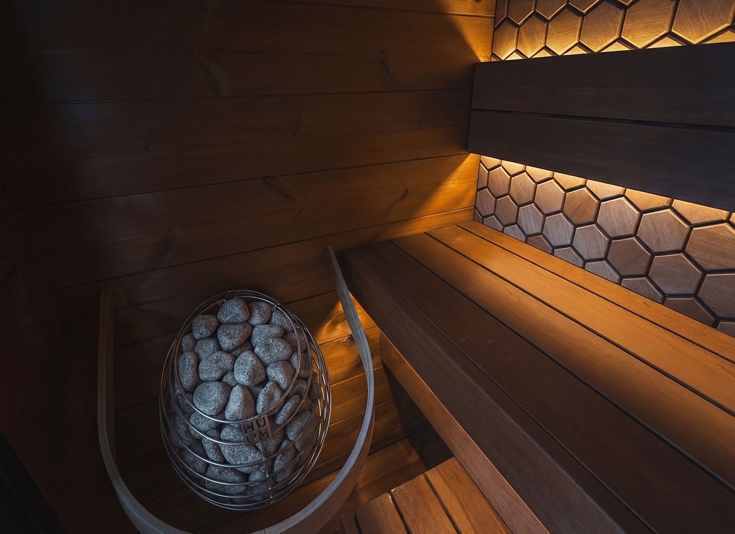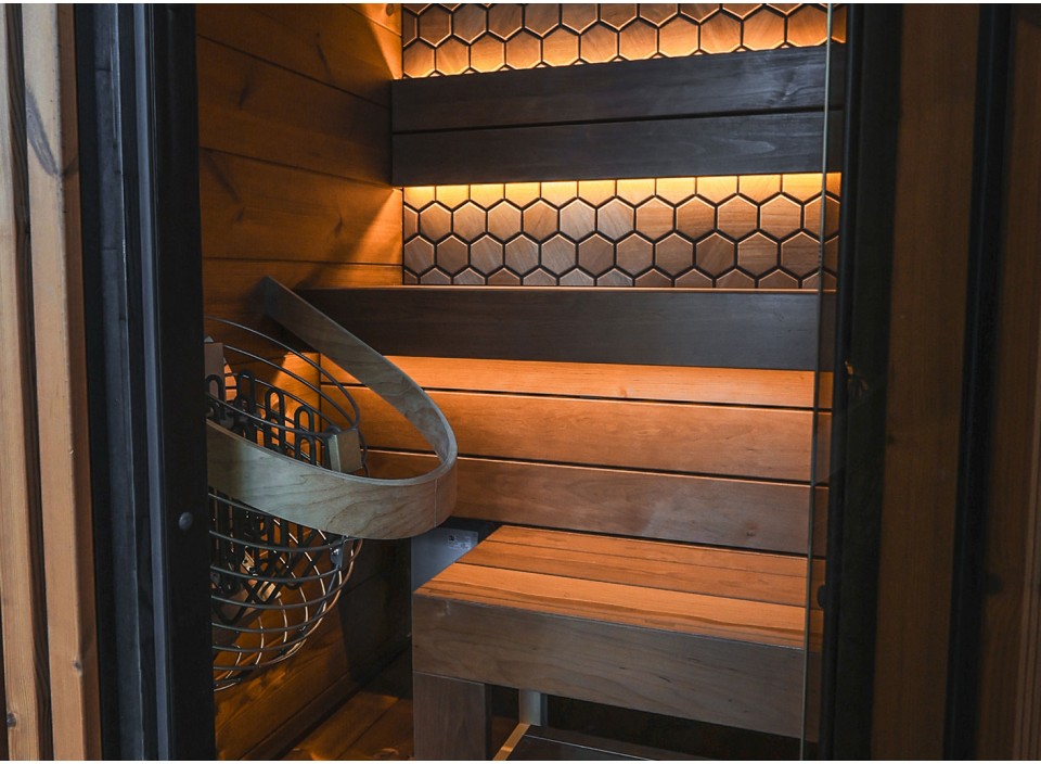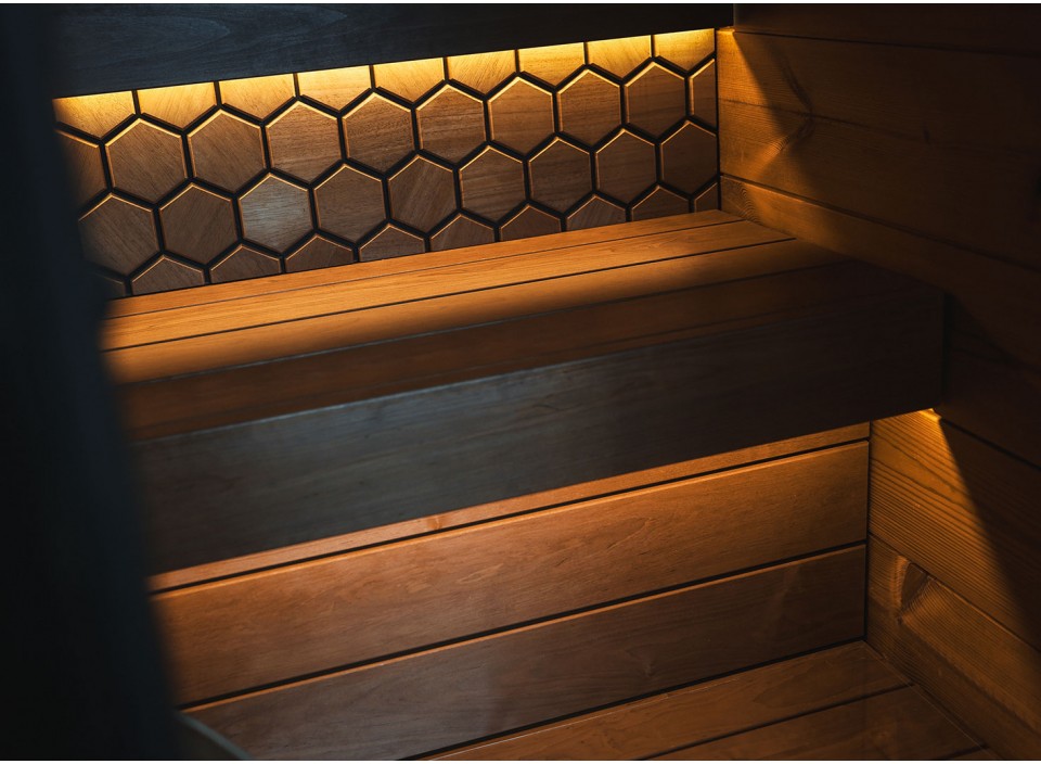 Des options permettent de personnaliser l’expérience, notamment l’éclairage LED sous les bancs ou derrière les dossiers, ainsi que des panneaux décoratifs pour le mur arrière. Le choix du poêle est à prévoir séparément.