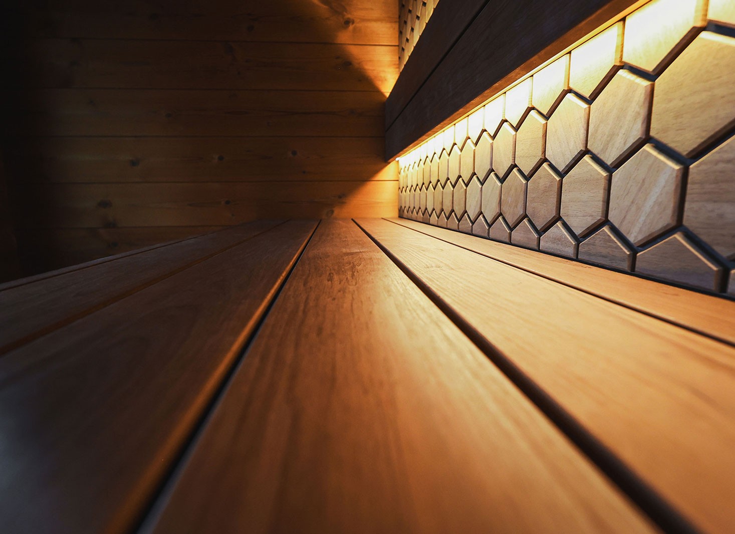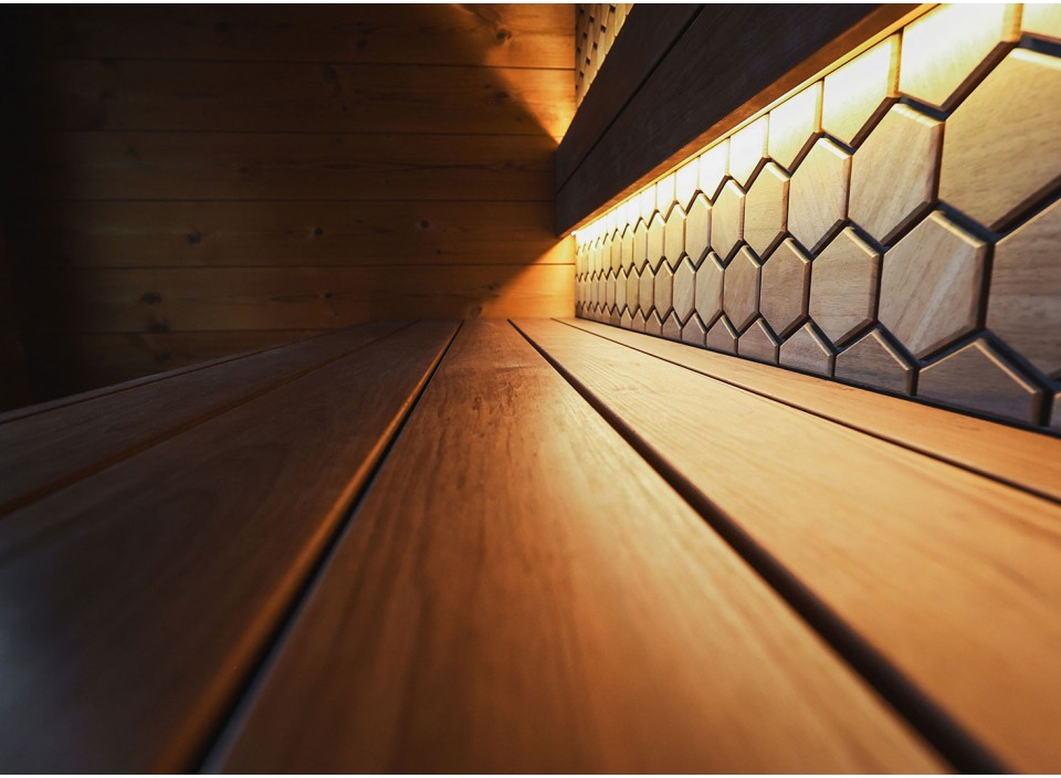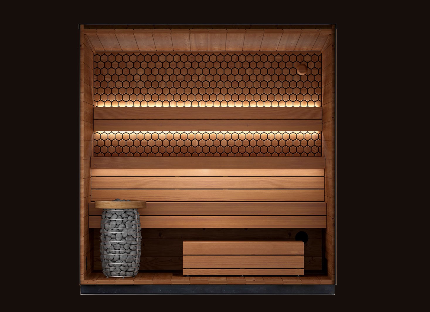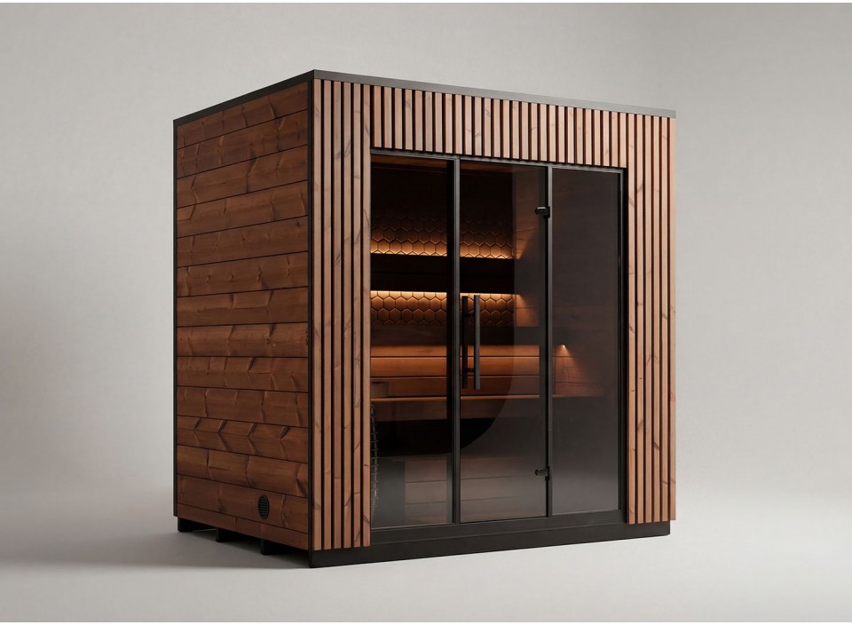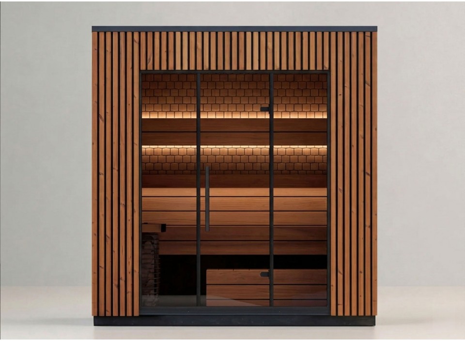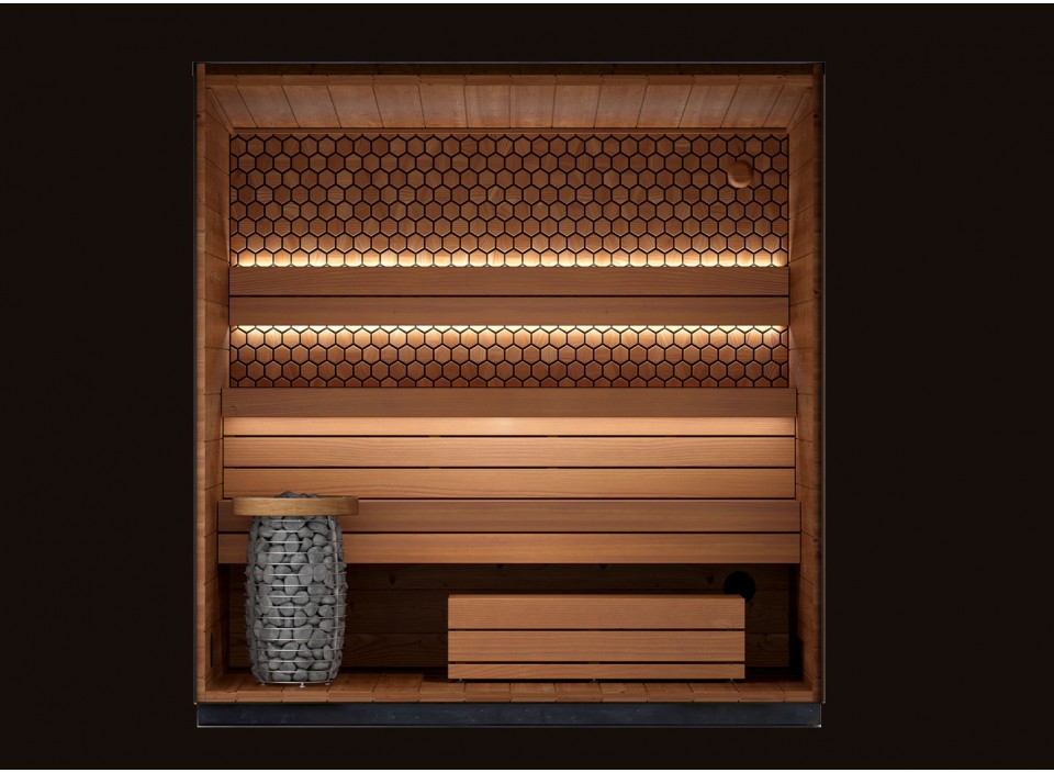 Le sauna comprend les parois, le sol et le plafond en ThermoWood®, des bancs et dossiers, une porte en verre trempé avec poignée premium, ainsi qu’un système de ventilation intégré.