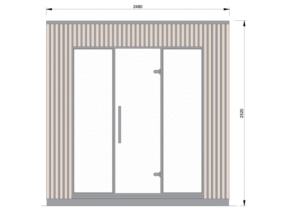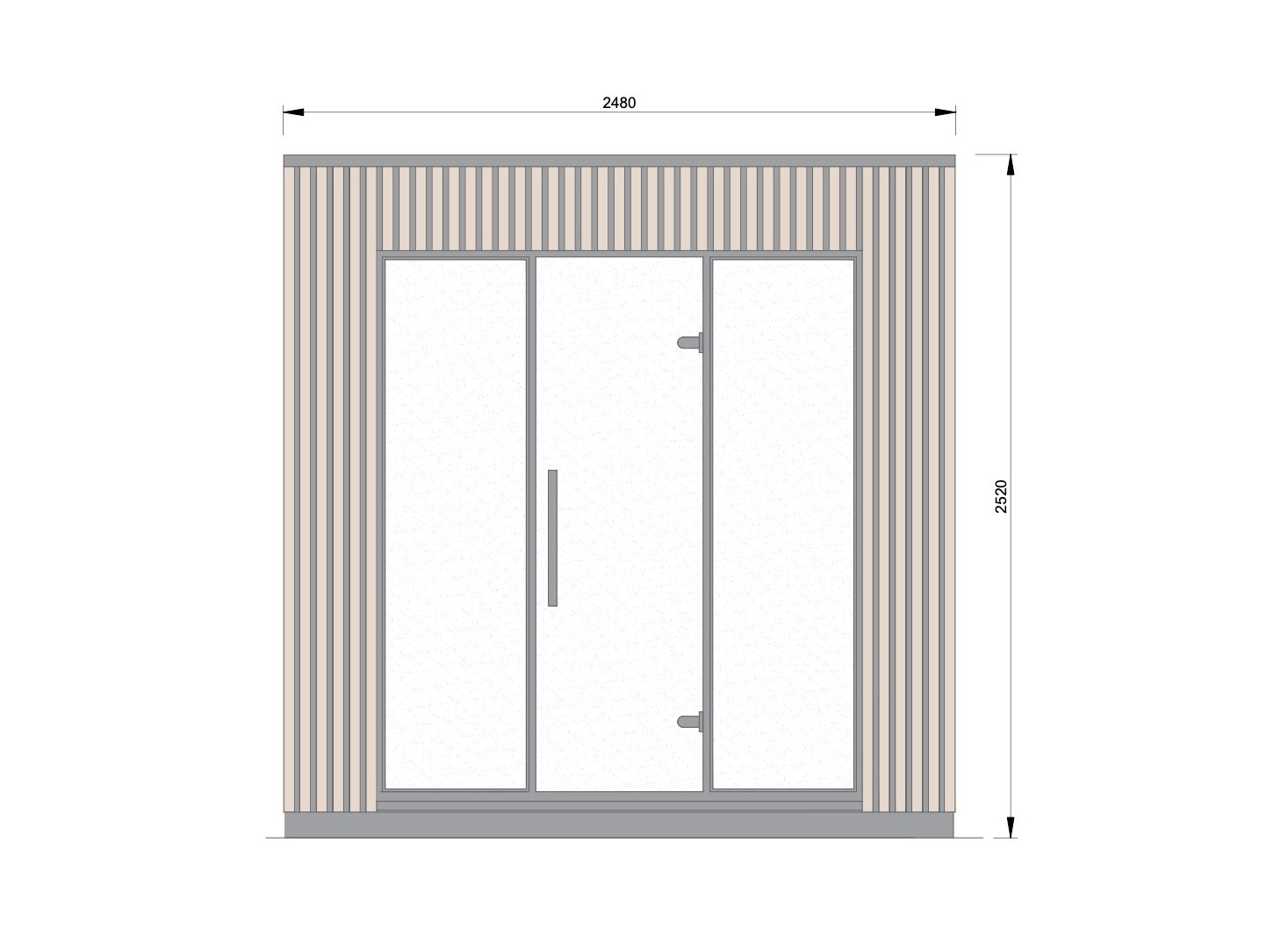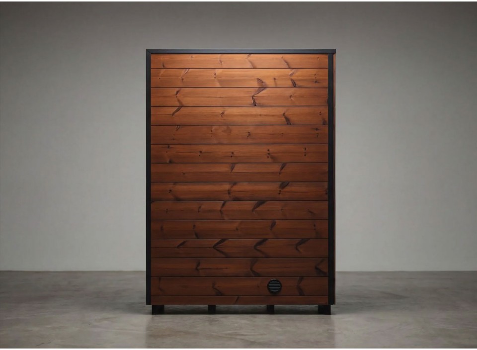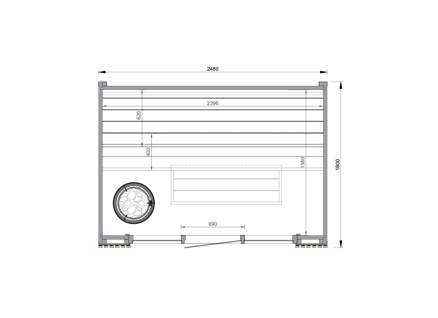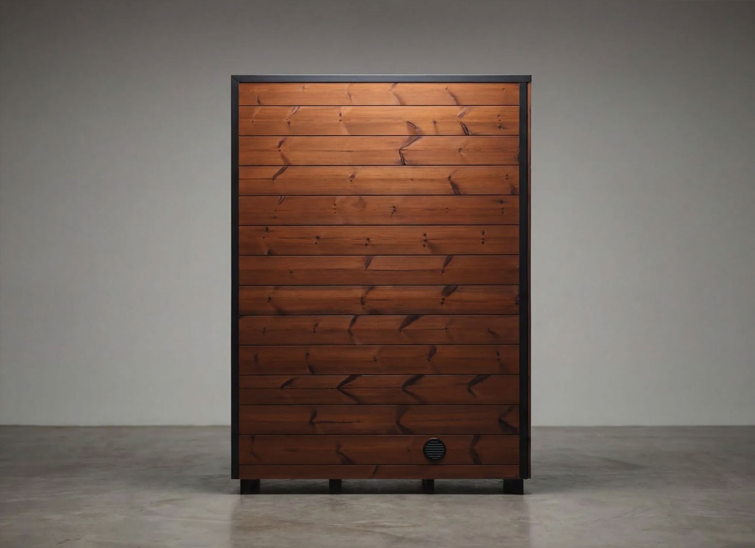 Le sauna comprend les parois, le sol et le plafond en ThermoWood®, des bancs et dossiers, une porte en verre trempé avec poignée premium, ainsi qu’un système de ventilation intégré.
