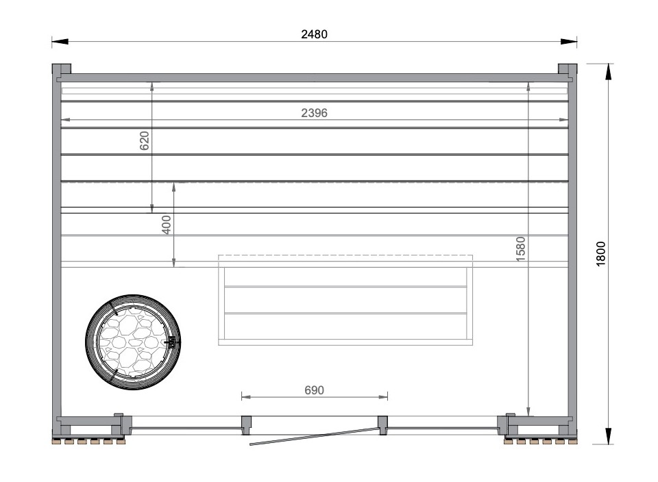 L’assise est alignée avec le niveau du poêle, favorisant une posture naturelle et une répartition plus homogène de la chaleur. Cette conception permet de bénéficier d’une expérience sauna équilibrée et enveloppante.